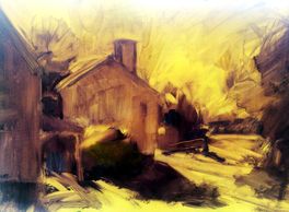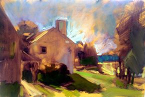 To get the plein air painting process started, Kriegshauser tints his panels with thinned Indian yellow, cadmium orange, or titanium white and then uses the dioxazine purple to establish an arrangement of big shapes and shadows. “I thin the dioxazine purple with a minimal amount of mineral spirits until the paint flows easily yet retains as much opacity as possible.,” the artist explains. “I compare the consistency of this mix to that of a black Magic Marker (thin but opaque). I then load a 1 ½” long chiseled, soft, synthetic brush with the purple mix and start my value study. I work quickly, painting directly on my birch panel, blocking in the darkest darks and mapping out the large foundational shapes. I continue to thin the paint as the values lighten. Within five minutes, I usually have a value study that sets the pattern for the light and dark values in the final painting. Unless I find preferable lighting patterns later, I stick with this initial value study and do my best not to chase the changing patterns light.